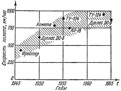 Рис. 20. График роста скоростей пассажирских и транспортных самолетов за последние 20 лет (по В. Мясищеву)