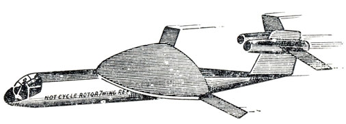 Но все это полумеры. Для истребителя-перехватчика, например, они не подходят. Он должен взлетать и садиться без разбега, с очень небольшой площадки. Не подходят они и для пассажирских и транспортных аппаратов, обладающих высокой скоростью полета и большой грузоподъемностью. И вот десятки и сотни инженеров разных стран продолжают ломать голову над тем, как же решить эту задачу, которая сегодня кажется неразрешимой. Изобретательная человеческая мысль не желает мириться с пессимистическими прогнозами. Стремление решить проблему вертикального взлета и посадки наиболее эффективным образом привело к появлению самых неожиданных проектов летательных аппаратов. Так, конструкторы одной американской фирмы наделили свою новую вертикально взлетающую машину (рис. 22) легким алюминиевым ротором треугольной формы с тремя лопастями по углам. После осуществления взлета ротор выключается, одна из его лопастей "выстраивается" вдоль фюзеляжа, а поднимающиеся из него специальные створки закрывают зазор "лопасть — фюзеляж". Остальные две лопасти при этом превращаются в придатки треугольного крыла и участвуют в создании подъемной силы, удерживающей машину в воздухе. Новый вид вертолета-самолета развивает скорость в горизонтальном полете до 700 км/час. При приземлении аппарата ротор вновь приводится в движение, и машина спускается по вертикали на землю, не требуя аэродрома. Ротор аппарата вращается газовой турбиной. Движение по горизонтали осуществляется на реактивных двигателях, находящихся в конце фюзеляжа. Идею вращающегося треугольного крыла использовали и конструкторы другой американской фирмы. Больше того, они развили ее дальше. В предложенном ими проекте самолета "Гелиплейн" машина снабжена двумя вращающимися треугольными крыльями, но уже без концевых лопастей. Роль последних в создании необходимой вертикальной тяги, по замыслу конструкторов, должны выполнять отклоняющиеся концевые части крыльев. Предполагается, что подобные машины, обладая способностью вертикального взлета и посадки, смогут развивать скорость до 950 км/час. Еще более оригинальный проект вертикально взлетающего пассажирского аппарата предложил немецкий изобретатель Рейнхольд Каллетш. Во время стоянки на земле эта машина должна напоминать самолет без крыльев, опирающийся на телескопические стойки шасси длиной 5 м. Особенностью этого аппарата является подъемное устройство, представляющее собой три вращающиеся в перпендикулярной к фюзеляжу плоскости штанги-спицы, на концах которых шарнирно укреплены эллипсообразные пластины-крылья. На взлете и при посадке для вращения такого составленного из крыльев "винта" должны применяться укрепленные на штангах реактивные сопла, к которым подаются газы от турбореактивных двигателей самого аппарата. Аналогичное устройство, но уже меньших размеров предусмотрено и на хвосте фюзеляжа. Во время вращения "винтов" специальное приспособление будет управлять положением пластин-крыльев с таким расчетом, чтобы они все время находились под некоторым углом атаки к набегающему потоку и, следовательно, создавали необходимую подъемную силу. После осуществления вертикального старта "винты" будут останавливаться, и их пластины-крылья станут выполнять свои традиционные функции.