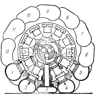 Рис. 4. Шагающее колесо. А — втулка колеса, в которой перемещается золотник, распределяющий давление воздуха в камерах. Б — полость золотника, обеспечивающая сообщение камер 1 и 2 с атмосферой. В — полость золотника, по которой воздух под давлением идет от компрессора в камеру 4