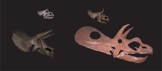 Также утверждалось – опять-таки Хорнером и коллегами, – что аналогичные изменения были и у цератопсов. Три гигантских рогатых динозавра – трицератопс, недоцератопс и торозавр – жили более или менее одновременно, причем в одном и том же регионе западной части Северной Америки. Отличия в форме морды, рогов и гребней привели к тому, что всех их выделили в отдельные, хоть и родственные виды.
