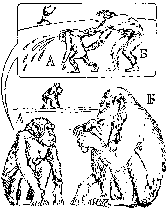 Детеныш высокоранговой самки (рис. 7.6А) обычно довольно рано начинает замечать, что когда его мать рядом, некоторые животные (Б) ведут себя совершенно иначе, чем когда она далеко. Поэтому ему не следует пытаться отобрать у такого сородича пищу, если мать далеко и не сможет его защитить Позже он обнаруживает, что особенно осторожным ему надо быть в присутствии В — союзника Б, потому что социальный ранг его матери может быть недостаточным для победы над Б+в Однако если рядом с матерью находится ее взрослый сын или дочь, то вместе они могут устрашить и эту пару Усвоив постепенно, каковы их отношения с другими обезьянами, он замечает, как они меняются в зависимости от близости его самого и матери Так мало-помалу детеныш шимпанзе расширяет свои знания о «правилах поведения» в сообществе.
