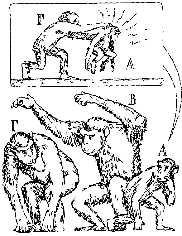 В результате накопления такой информации и непосредственного опыта детеныш в конце концов выучивается «правильно вести себя» в различных ситуациях и предвидеть возможное влияние поведения — его собственного и союзников на других животных. Например, если детеныш видит, что обезьяна В атакует Г, он понимает, что Г может повернуться и напасть на него самого (на рис. 7.7 это изображено как «мысленное представление» у А), т. е. переадресовать агрессию. Если А способен предвидеть такой поворот событий, то он может избежать нападения Г: не попадать под горячую руку. Более того, если А, наблюдая взаимодействия между В и Г, понял, что В старше по рангу, то он сообразит, что В — более выгодный для него союзник против Г, чем Г как союзник против В. Накапливая такой опыт, детеныш шимпанзе приобретает способность ловко лавировать в самых разных ситуациях.