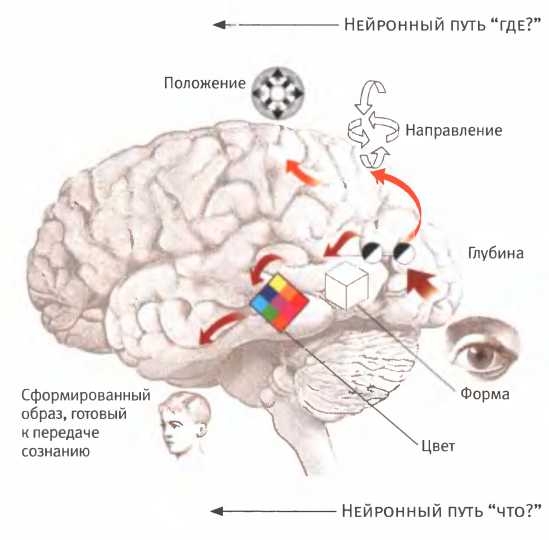 Бессознательные конвейеры конструируют из видимых нами деталей распознаваемые образы. Отдельный проводящий путь отвечает за определение положения наблюдаемого объекта в пространстве.