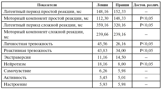 Определенные корреляции обнаруживаются между психофизиологическими характеристиками и личностными особенностями спортсменов, с одной стороны, и типом моторного доминирования, с другой стороны. Например, фехтовальщики-левши существенно отличаются от правшей более высоким уровнем реактивной и личностной тревожности, неуравновешенным типом нервной системы, более высоким уровнем невротизма (табл. 37). У спортсменов, фехтующих левой рукой, отмечено преобладание предметно-образного мышления и меньшая способность к абстрактно-логическому мышлению, преобладание холерического и меланхолического темперамента, предпочтение в боевой деятельности более простых технико-тактических действий с большей скоростью их выполнения. Вместе с тем им присуща худшая скорость переработки сложной информации, большее латентное время реакции с выбором, что затрудняет использование более сложных технических действий и принятие решений в сложных экспромтных ситуациях.