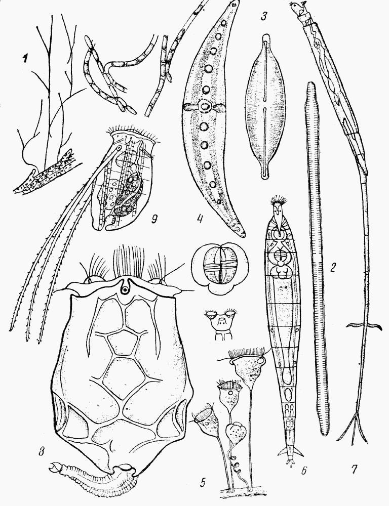 Таблица LXXX. ?-Мезосапробы: Рис. 1. Кладотрикс (Cladothrix dichotoma) (по Вислоуху). - Рис. 2. Синедра (Synedra ulna var. splendens) (по Вислоуху). - Рис. 3. Навикула (Navicula aтbigua) (по Вислоуху). - Рис. 4. Клостериум (Closterium moniliferum) (по Вислоуху). - Рис. 5. Сувойка (Vorticella campanula) (из Вислоуха, как и рис. 6-9). - Рис. 6. Коловратка ротифер (Rotifer vulgaris). - Рис. 7. Коловратка ротифер (Rotifer actinurus). - Рис. 8. Коловратка брахионус (Brachionus angularis). - Puc. 9. Коловратка триартра (Triarthra longiseta).
