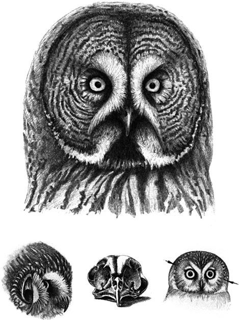 Бородатая неясыть с огромным лицевым диском для улавливания звуков. На миниатюре (в центре) показана выраженная асимметрия черепа североамериканского мохноногого сыча, уши которого, как и уши бородатой неясыти, несимметричны; левое ушное отверстие у сыча (слева), расположение ушей (справа, стрелки)