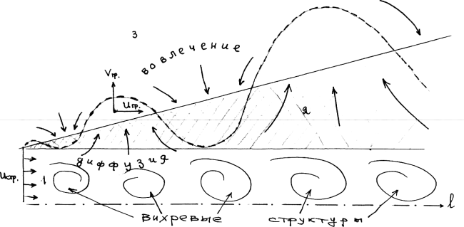 На Рис. 3.1. схематично изображено движение струи в некоторой среде, сопровождающееся взаимным проникновением вещества потока в среду и среды в поток.