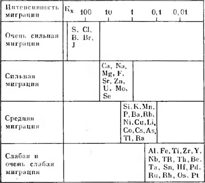 Это отношение — коэффициент водной миграции (Kx) — рассчитано для большинства химических элементов; установлена его связь с показателем, используемым Полыновым.