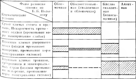 Табл. 5. Фазы развития коры выветривания изверженных пород в зависимости от климатических условий