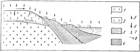 1 — коренная порода; 2 — кора выветривания; континентальные отложения: 3 — делювий; 4 — аллювий; 5 — поступление веществ в кору выветривания из атмосферы (H2O, CO2, O2 и др.); 6 — вынос веществ из коры выветривания поверхностным и подземным стоком; 7 — аккумуляция веществ из грунтовых вод; 8 — аккумуляция легкоподвижных продуктов выветривания и взвешенного материала из поверхностных вод