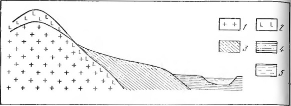 1 — коренная изверженная порода; 2 — обызвесткованньй ортоэлювий; 3 — карбонатный делювий. Область аккумуляции легкорастворимых солей: 4 — озерный аллювий — хлоридно-сульфатные аккумуляции; 5 — соленое озеро