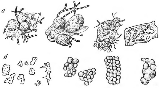 Рис. 14. Гидраты окислов железа (а), диатомовые водоросли и фитолитарии (б) в корочках выветривания на скалах в высокогорьях Тянь-Шаня.