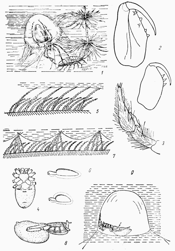 Таблица LXI. Водяной паук-серебрянка - Argyroneta aquatica: Рис. 1. Паук серебрянка и его воздушный колокол. - Рис. 2. Хелицеры самца и самки (внизу). Рис. 3. Дистальная часть щупальца самца. - Рис. 4. Положение трахейных и легочных стигм. - Рис. 5. Два типа волосков и их контакт с водой. - Рис. 6, Воздушный пузырь самца (вверху) и самки (по Вагнеру). - Рис. 7. Пучки волосков и их контакт с водой. - Рис. 8. Смачивание слюной задней лапки. - Рис. 9. Поза еды.