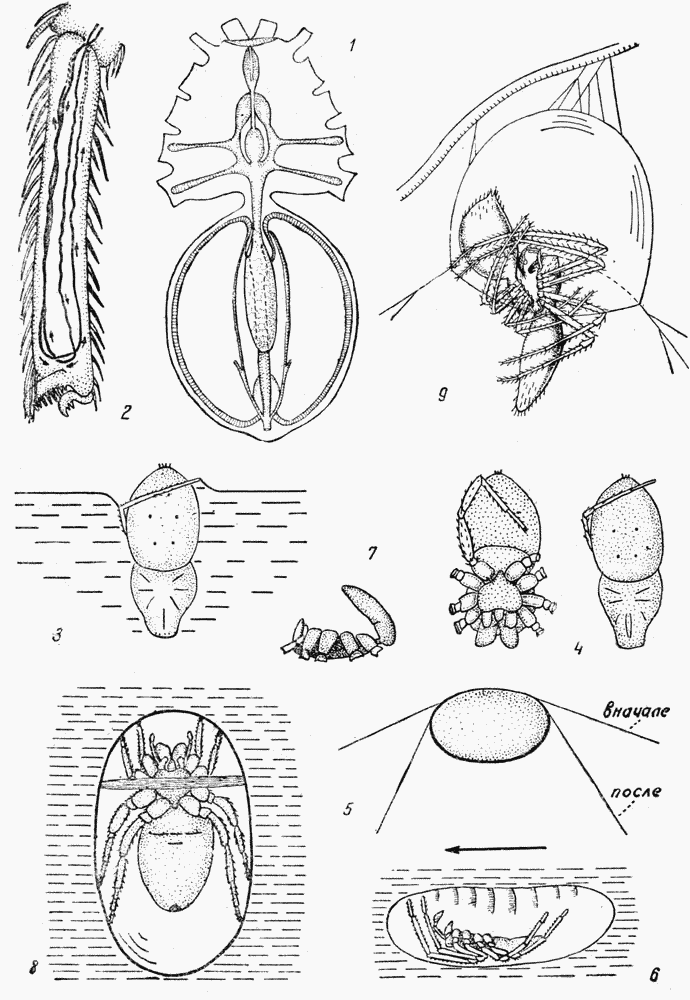 Таблица LX1I. Водяной паук-серебрянка - Argyroneta aquatica: Рис. 1. Пищеварительная система. - Рис. 2. Трахейный капилляр в лапке. - Рис. 3. Прорыв поверхностной плёнки. - Рис. 4. Положение ног при заборе воздуха вентрально и дорзально (налево) (по Брауну). - Рис. 5. Укрепление колокола. - Рис. 6. Спермиевый колокол и самец в нем. - Рис. 7. Изгиб брюшка для пряжи ленты. - Рис. 8. Самец в спермиевом колоколе после приготовления ленты. - Рис. 9. Копуляция серебрянки.