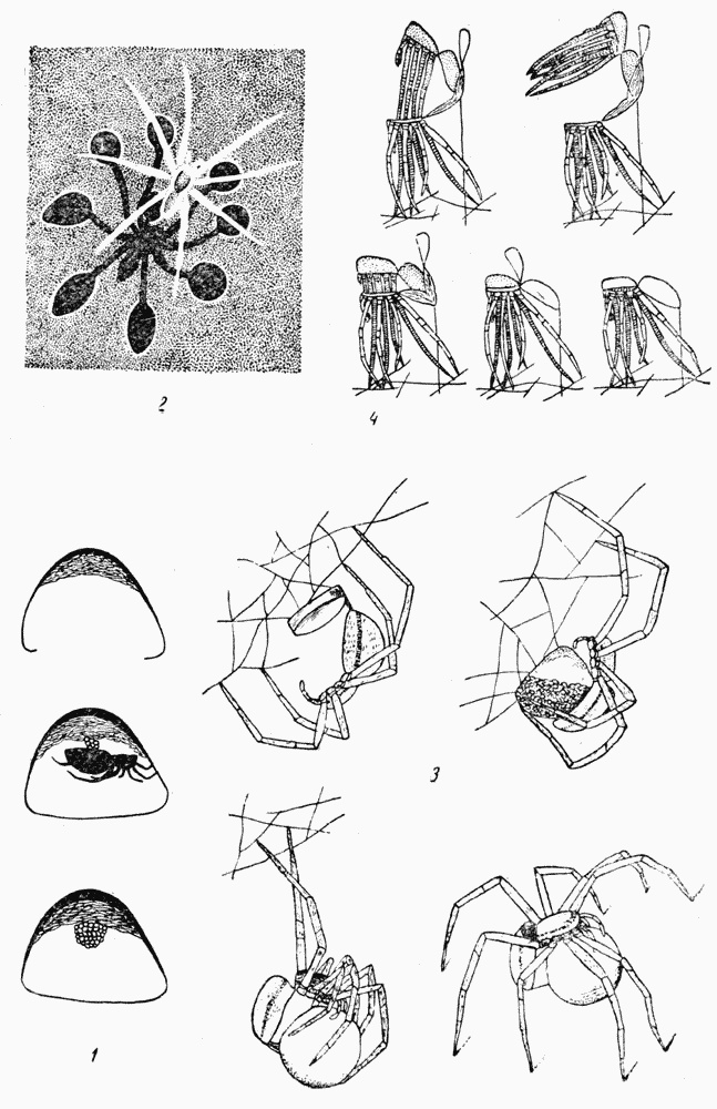 Таблица LXIII: Рис. 1. Яйцевая кладка Argyroneta aquatica. - Рис. 2. Доломедес (Dolomedes) на поверхности воды. - Рис. 3. Изготовление яйцевого кокона доломедес: плетение основы, откладка яиц, округление кокона, транспорт кокона. - Рис. 4. Линька доломедес.