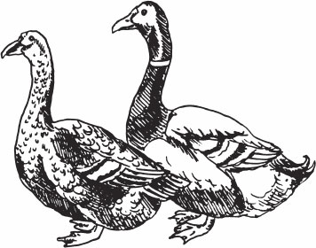 Отличительные признаки. Туловище массивное, поставлено горизонтально. Грудь глубокая и широкая. Широкая спина сужается к плечам и хвосту. Оперение по окрасу похоже на оперение диких уток. Темно-коричневая голова имеет две светло-коричневые полосы, направленные с обеих сторон от клюва к шее. Голова селезней темно-зеленого цвета. Цвет клюва зеленовато-желтый, на конце имеется темное пятно. Оперение шеи зеленого цвета, на конце белое. Грудь до плеч имеет красно-бурую окраску. Внизу туловище серого цвета. Цвет ног темно-оранжевый. Мясо обладает высокими вкусовыми качествами (рис. 36).