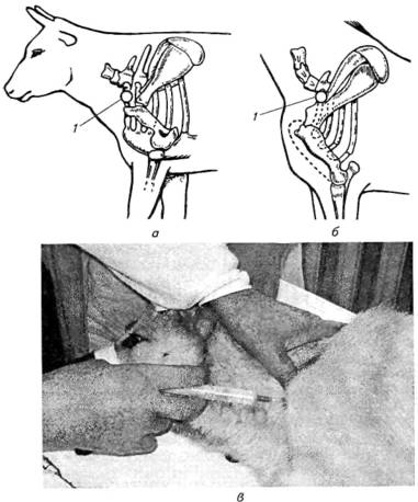 Техника блокады у крупного рогатого скота по Н. А. Уразаеву. У взрослого скота блокаду проводят в положении стоя, а у телят, собак и кошек — в положении лежа. Место вкола иглы определяют, отступив у коров на 1,5…2 см, у телят — на 1…1,5, а у мелких животных — на 0,5…1 см от каудального края поперечно-реберного отростка шестого шейного позвонка. После обработки места инъекции иглу вкалывают в найденную точку и продвигают ее назад, вверх и к середине (по диагонали) на расстояние 5…8 см (в зависимости от величины животного) до упора конца иглы в костную основу 1-го или 2-го грудного позвонка, на боковой поверхности которых лежат звездчатые узлы (рис. 6). У мелких животных иглу продвигают соответственно на глубину 2…3 см (см. рис. 6, в). У крупных животных перед инъекцией раствора новокаина иглу необходимо извлечь назад на 1…3 см из толщи длиннейшей мышцы шеи, прилегающей к телу позвонков. Критерием правильного введения раствора новокаина служит свободное его вхождение, отсутствие крови в просвете иглы и засасывание воздуха в грудную полость. Доза 0,5 %-ного теплого раствора новокаина телятам составляет 20…30 мл/гол., взрослому скоту — 50…80, крупным собакам — 10…12, кошкам — 2…3 мл/гол.
