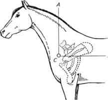 Техника блокады нижнего шейного симпатического узла по А. И. Федотову. При выполнении этой блокады лошадь фиксируют в положении стоя. Место вкола иглы определяют в точке, находящейся на пересечении вертикальной линии, опущенной из переднего угла поперечного отростка 7-го шейного позвонка и горизонтальной линии, проходящей через верхнюю треть 1-го ребра. Практически эта точка находится на 3,5…4,5 см впереди переднего края 1-го ребра (рис. 7).