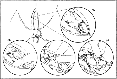 Удаление семенников, расположенных в брюшной полости: а) параллельный пенису разрез позволяет обнаружить связку мошонки, проходящую через паховый канал; б) другой способ обнаружения семенника: находят семяпровод на уровне предстательной железы и следуют вдоль него в направлении от этой железы к семеннику; в) семенной канатик пережимают и лигируют; г) семенной канатик рассекают и семенник извлекают, перерезав связку мошонки