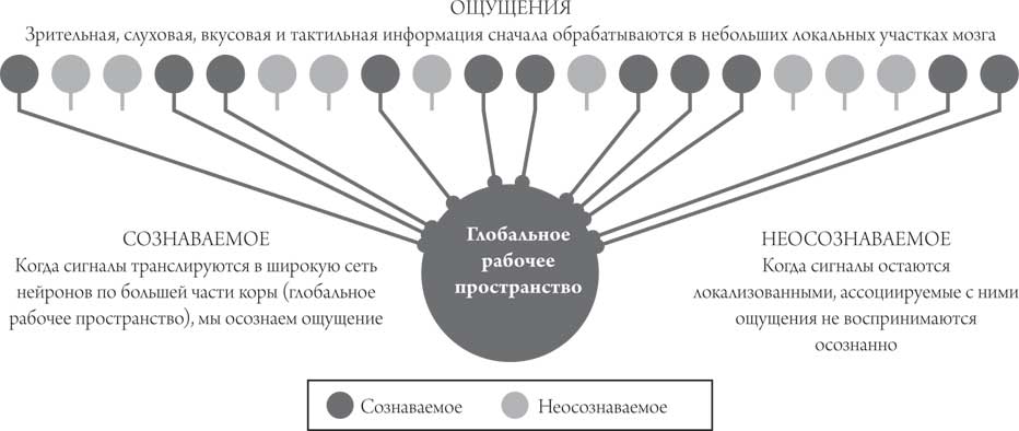 Рис. 2.3. Транслирующееся сознание: глобальное рабочее пространство предполагает, что сознание рождается из высоко координированной и широко распространенной деятельности мозга