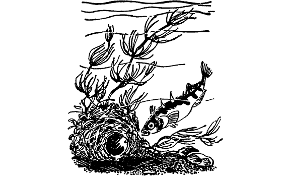 Отличный семьянин и искусный строитель самец маленькой рыбки колюшки. Перед началом нереста самец отыскивает подходящее место и приступает к постройке гнезда. Выкопав ямку, он выстилает ее водорослями, потом воздвигает из стеблей водных растений и корешков стенки и крышу и скрепляет ее клейкой слизью.