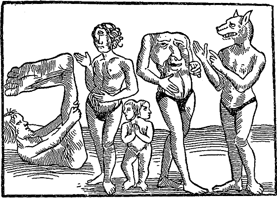 Фантастические изображения уродливых человеческих племен («Космография» Мюнстера, 1550).