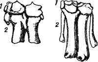 Рис. 63. Строение запястья и пясти у парнокопытных при инадаптивном (а) и адаптивном (б) типах эволюционных преобразований (по В. О. Ковалевскому):