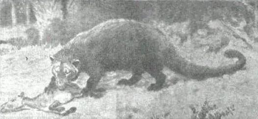 Рис. 64. Реставрация древнего плотоядного млекопитающего — креодонта — из эоцена, пожирающего маленького Eohippus — предка современной лошади. (Рис. взят из книги К. Вилли, В. Детье «Биология».)