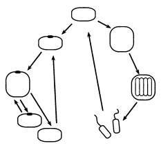 Хочется обратить внимание на интересную особенность восьмиклеточного организма, образующего цикл 2 (на последнем рисунке): пространственное расположение клеток и их плотное «прилипание» друг к другу привели к тому, что клетки дифференцировались на два четких типа, напоминающие настоящие ткани: округлые осевые клетки и сильно вытянутые боковые клетки. Эти последние по своему расположению и форме явно имеют предпосылки в будущем превратиться в покровную ткань (эпителий). Кроме того, в цикле 2 решающую роль играет передача вытянутыми боковыми клетками сигнального вещества X от головной клетки — задним осевым клеткам. Это стабилизирует систему индивидуального развития, выравнивая величину Px вдоль продольной оси тела и предотвращая образование глазка на заднем конце. Такая функция продольных клеток создает предпосылки для того, чтобы в будущем на этой основе начала развиваться нервная система.