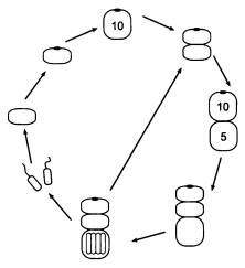 Как видим, получился очень интересный онтогенез с двумя замкнутыми циклами. В первом цикле основная жизненная форма — сложный восемнадцатиклеточный организм, который, созрев, производит гаметы, воспроизводит точную уменьшенную копию самого себя и одновременно отпочковывает восьмиклеточный двусторонне-симметричный организм с характерным обликом. Второй цикл состоит в том, что этот восьмиклеточный организм, произведя гаметы, автоматически возвращается к своему исходному строению.