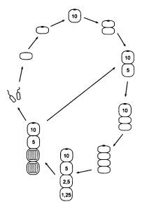 Итак, рассмотрим Metazoon, у которого при Px = 5 митоз происходит особенно быстро (так, что не успевает произойти мейоз в одновременно созревших клетках). В этом случае неизбежно возникает восьмиклеточный организм, а заодно и новый способ бесполого размножения (на рисунке все идет по часовой стрелке).