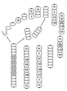 В чем секрет? Оказывается, все дело в сигнальном веществе X. Как только у клетки появляется глазок, концентрация вещества X в ней почти мгновенно достигает максимального уровня 10. Избыточные количества вещества X интенсивно откачиваются из клетки и… проникают в соседнюю, «прилипшую» сзади вторую клетку. И там устанавливается постоянная концентрация X, равная 5. Раньше, когда клетки расходились сразу после деления, подобных ситуаций не возникало. Только теперь, когда клетки остались слипшимися, стало ясно, что проницаемость мембраны для вещества X такова, что в клетке, примыкающей к своей «соседке» с глазком, устанавливается половинная концентрация вещества X. Если к клетке с концентрацией 5 «прилипнет» еще одна клетка без глазка, то в ней установится концентрация 2,5, и так далее, каждый раз вдвое меньше. Раньше это свойство клеточных мембран Protozoon не имело существенного значения, но теперь оно становится ключевым фактором формообразования.