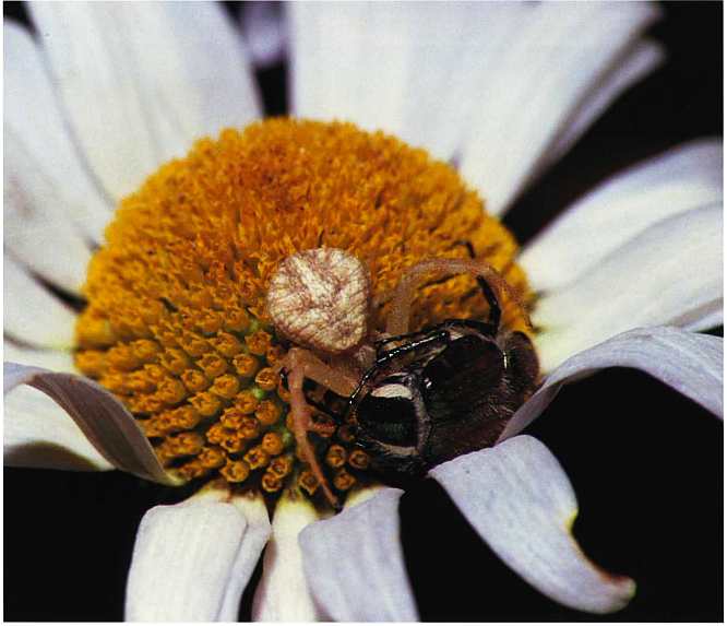 Хотя сами пауки и являются опасными хищниками, но и они не застрахованы от нападения. Этот паук-краб сейчас умрет, борясь с жуком-паукоедом (Coleoptera).