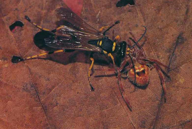Оса-пелопей увернулась от смертоносного яда паука и укусом своего жала лишила его возможности двигаться. Этому пауку суждено стать пищей для подрастающих личинок осы.