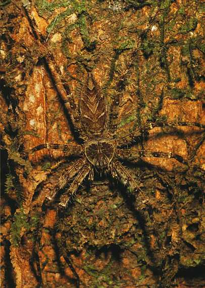 Этот охотник, или гигантский паук-краб, прекрасно замаскирован, когда прижимается к коре дерева. Это помогает ему избежать излишнего внимания со стороны хищников и спрятаться от своих будущих жертв.