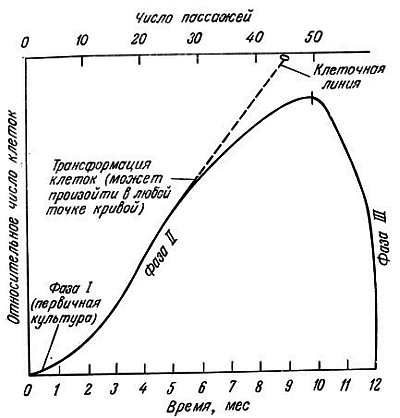 Рис. 8.1. Диаграмма происхождения клеточных штаммов и феномена трансформации клеток в культуре [26]. Фаза I, первичная культура, завершается формированием первого монослоя. Фаза II характеризуется усиленным ростом, требующим частых пересевов. Когда культура достигает этой фазы, ее называют 'клеточным штаммом'. В результате какого-либо изменения может возникнуть клеточная линия с неограниченной продолжительностью жизни или клетки вступают в фазу III и погибают