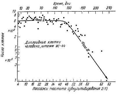 Исследования показывают, что эукариотические клетки всех типов подвержены старению и теряют пролиферативную активность после определенного периода in vivo, in vitro и даже после пересадки более молодым реципиентам. Это свойство, вероятно, определяется не цитоплазматическим фактором, а геномом. Следовательно, старение клеток и смерть являются их неотъемлемыми свойствами. Пролиферативная способность клеток различных типов неодинакова, она зависит от типа и степени их дифференцировки. Некоторые клетки превращают деление на ранней стадии развития, а другие продолжают делиться в течение всей жизни. Клетки кожи, кроветворной системы и эпителия молочной железы грызунов сохраняют способность к росту и пролиферации до конца жизни животного. Пересаживая эти ткани молодым реципиентам, можно отсрочить их старение и сохранить жизнеспособность на период времени, больший максимальной продолжительности жизни хозяина. Таким образом, рост и жизнеспособность" клеток можно изменить с помощью некоторых приемов. Эти свойства также, вероятно, определяются физиологическим состоянием животного, а не его хронологическим возрастом. Итак, причиной старения организма является старение клеток.