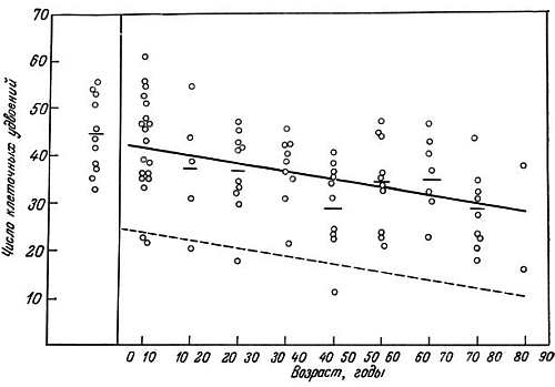 Ситуация стала более ясной, когда в качестве реципиентов, кроветворных клеток вместо облученных мышей использовали, животных с генетически детерминированной анемией [21, 22]. Клетки молодых и старых доноров излечивают анемию и одинаково хорошо размножаются в течение 36 мес при четырех последовательных трансплантациях. Однако наблюдается постепенное снижение колониеобразующей активности стволовых клеток, которая регистрируется по числу колоний в селезенке реципиента, причем снижение больше выражено для клеток старых доноров. По-видимому, можно сделать вывод, что кроветворные клетки способны лишь к ограниченному числу делений, хотя они могут делиться в течение времени, превышающего продолжительность жизни мыши.