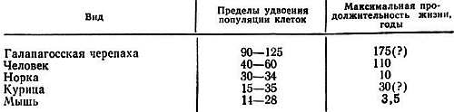 Были предприняты попытки установить взаимосвязь между продолжительностью жизни вида и потенциалом деления фибробластов, и хотя были изучены лишь немногие виды с разной продолжительностью жизни, результаты указывают на наличие положительной корреляции между этими величинами (табл. 8.2). Фибробласты эмбриона галапагосской черепахи, наиболее долгоживущего вида среди изученных, обладают и самым высоким потенциалом деления, тогда как для мыши, чья продолжительность жизни не превышает трех лет, эта величина значительно меньше.
