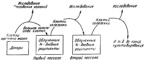 Рис. 8.4. Исследование колониеобразующей активности клеток костного мозга методом серийных трансплантаций облученным реципиентам [44]
