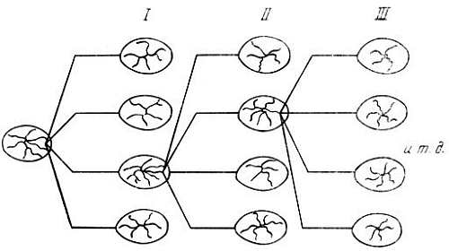 Рис. 8.5. Схема серийных пересадок ткани молочной железы мышей [10]. Первичные имплантаты получают из одной железы донора и пересаживают в 10–14 жировых подушечек реципиента, освобожденных от железистой ткани (генерация I). Материал для последующих пересадок всегда берут из наиболее активно растущего трансплантата предшествующей генерации. Скорость роста выражают в средних процентах прижившихся трансплантатов данной генерации