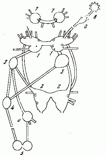 Рис. 14. Центральная нервная система переднежаберного моллюска Pomatiaselegansи позиции центральных нейронов, содержащих биогенные амины. Обозначение ганглиев: 1 — церебральный, 2 — педальный, 3 — плевральный, 4 — супраинтестинальный, 5 — висцеральный, 6 — субинтестинальный, 7 — буккальный, 8 — тентакулярный. В ганглиях 4 — 6 выявление биогенных аминов не проводили. В плевральных и тентакулярных ганглиях моноаминергические нейроны не обнаружены.