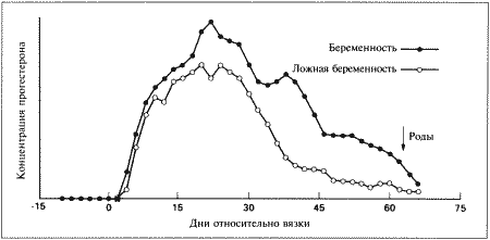 Изменения концентрации прогестерона в плазме крови при физиологической и ложной беременности. Воспроизведено из кн. Lane и Cooper «Veterinary Nursing», (1994) с разрешения Butterworth Heinemann