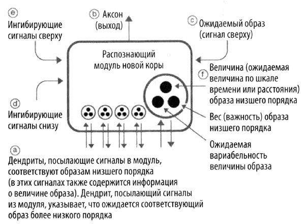 Что же делает распознающий модуль? Он вычисляет вероятность (основанную на предыдущем опыте) того, что тот образ, за распознавание которого он отвечает, действительно представлен активными входными сигналами. Каждый поступающий на модуль сигнал активен в том случае, если возбужден соответствующий распознающий модуль более низкого порядка (это означает, что произошло распознавание образа более низкого порядка). Каждый входной сигнал также кодирует наблюдаемую величину сигнала (в подходящем измерении — в единицах времени, каких-то физических величин или иных параметров), так что эти величины сравниваются модулем с соответствующими величинами предыдущих сигналов для расчета вероятности того, что это «правильный» образ.