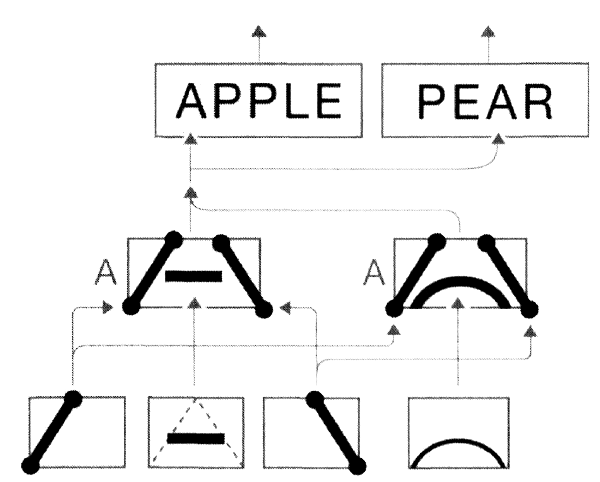 Два разных образа, составляющих букву «А» и два разных образа более высокого порядка (APPLE и PEAR), в состав которых входит «А».