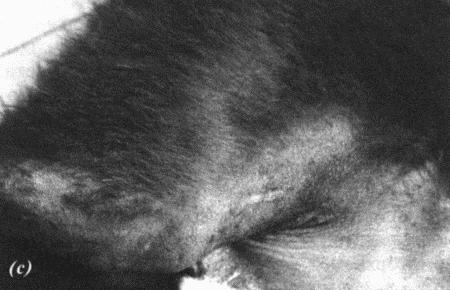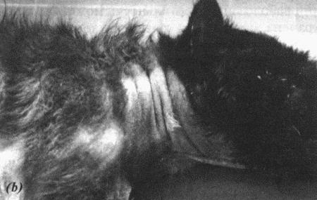 (а) Опухоль семенника у кобеля-крипторха; (b, с) дерматологические нарушения, обусловленные опухолью (см. Приложение)