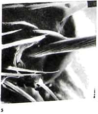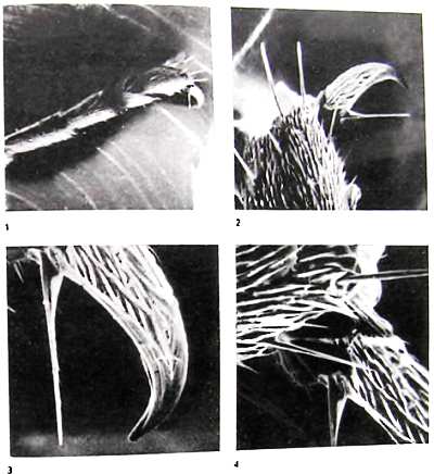 Последние членики лапки осы обыкновенной, заснятые при возрастающих увеличениях. Лапка с коготком на самом конце. Все более и более крупно выглядит концевой коготок. На последнем снимке — два типа волосков. «Иногда даже у хороших «землекопов», как, например, у роющих ос, ноги почти не отклоняются от нормального строения. Дело ограничивается усилением лапки и ее волосистости», — дает справку один из классиков энтомологии Д. Шарп.