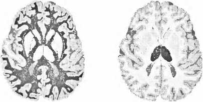 Рис. 19. Для сознания важны три здоровые и хорошо функционирующие структуры мозга, здесь они помечены черным. Слева — здоровая кора больших полушарий. Справа — таламус. Посредине — белое вещество, где осуществляется связь между корой и таламусом.
