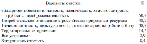 Наиболее неприемлемым в образе жизни иностранцев, по мнению населения, являются такие черты в их поведении, как «наглость», «навязчивость», «хитрость и грубость» и др. Ответы на вопрос «Что для Вас неприемлемо в поведении и образе жизни иностранных граждан, живущих в Вашем городе?» распределились следующим образом: