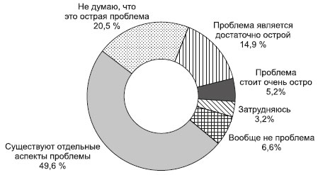 На вопрос «Существуют ли проблема присутствия мигрантов в Байкальском регионе?» многие опрашиваемые отвечают, что существуют отдельные аспекты проблемы, 1/4 часть респондентов не думают, что это острая проблема, и лишь незначительное число респондентов считают, что проблема стоит очень остро (рис. 13.11).